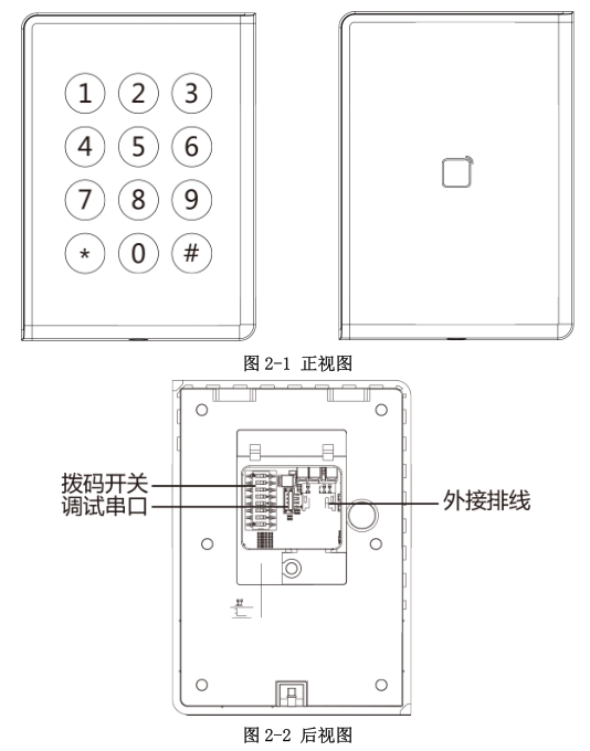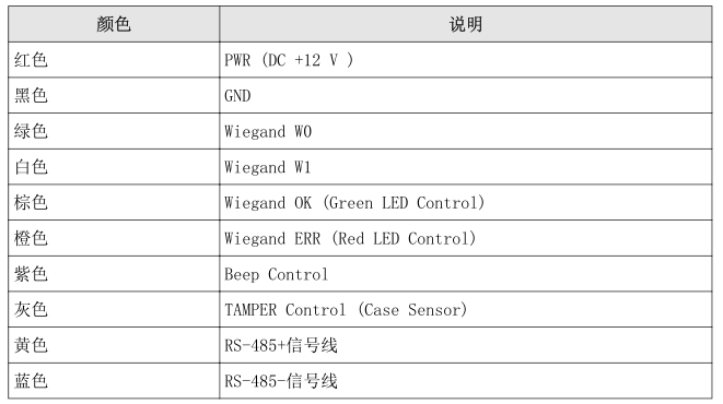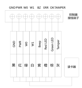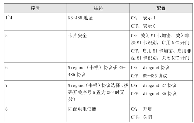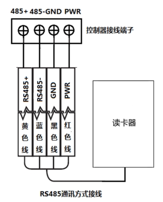 RS-485 接线读卡器可通过 RS-485 通讯方式与其他设备连接。操作步骤1. 设置设备工作模式:将拨码位 6 拨至 OFF。2. 设置 RS-485 通讯地址:将拨码位 1~4 设为读卡器 RS-485 通讯地址。3. 根据下图进行 RS-485 接线。